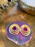 Diseño geométrico de 5 cm con tres círculos entrelazados en su interior, bañados en oro brasileño de 18k. Un accesorio moderno y elegante que simboliza movimiento y armonía, ideal para destacar con estilo atemporal.